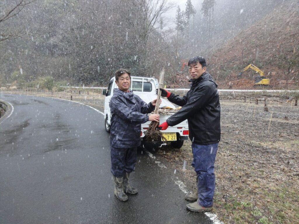 「昨日(3月10日)、ウルシの植樹祭が無事終わりました!」と、奥久慈漆生産組合の神長顧問よりご連絡をいただきました。当日はピンポイントで茨城県に雪が降るあいにくの天気。それでも19名の有志が集まり、お昼までに180本のウルシ苗を植えられたとのことです。終わる頃には雪も止み、「雪で寒くて作業は大変だったけど、土壌もちょうどよく湿り、春に向けてウルシにとっては良かったかも知れないね」と前向きな神長さん。先行して植えた120本と併せて計300本の植樹祭となりました。