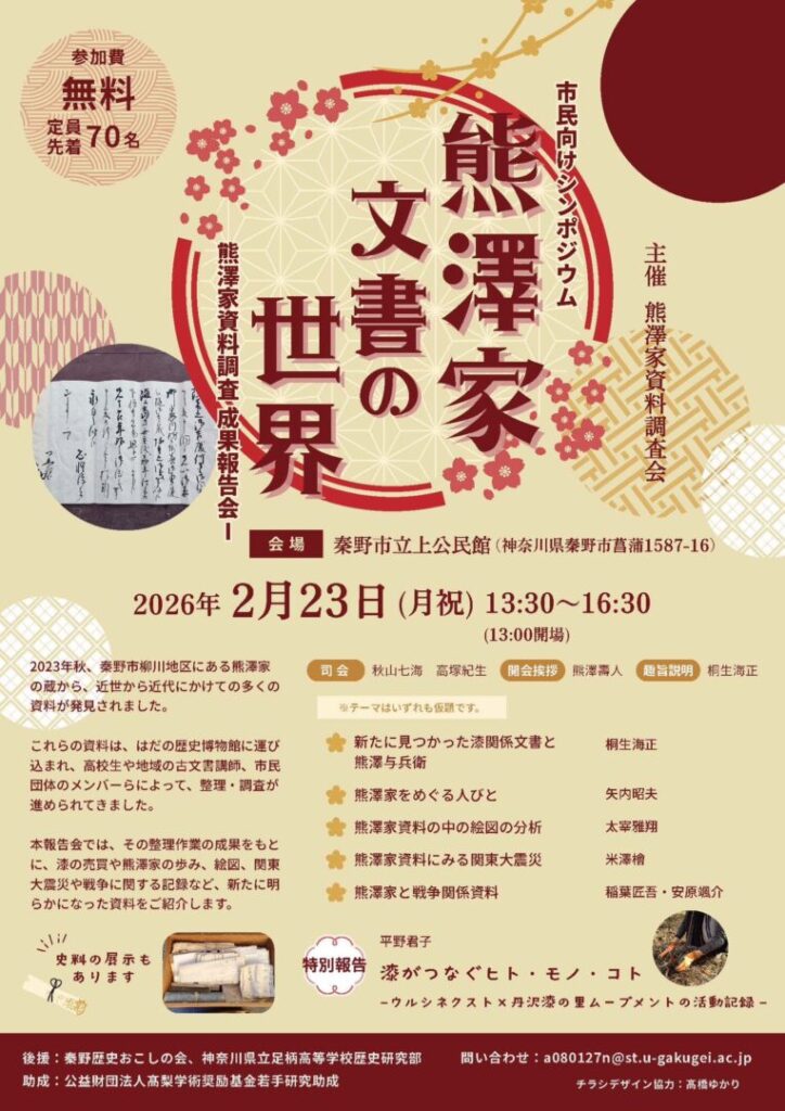 2月23日(月・祝)、神奈川県秦野市立上公民館にて、市民向けシンポジウム「熊澤家文書の世界―熊澤家資料調査 成果報告会―」が開催され、ウルシネクストも特別報告として登壇しました。