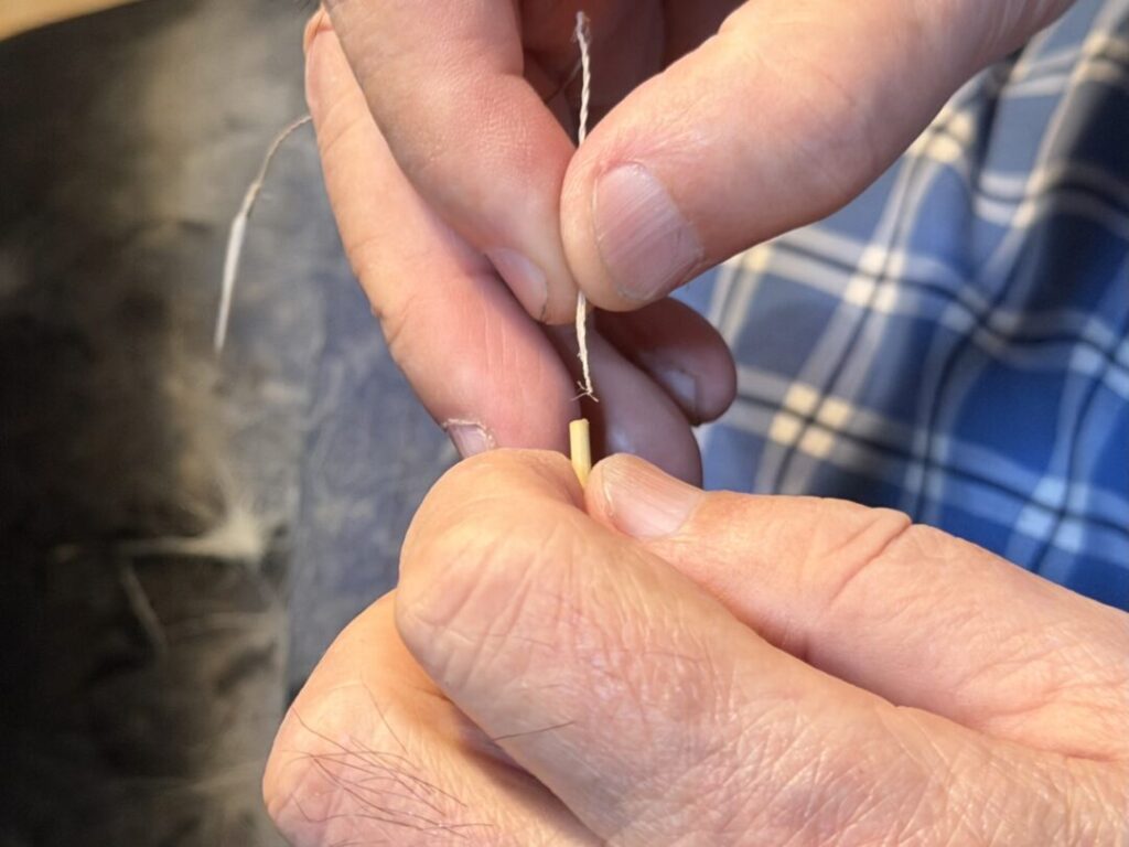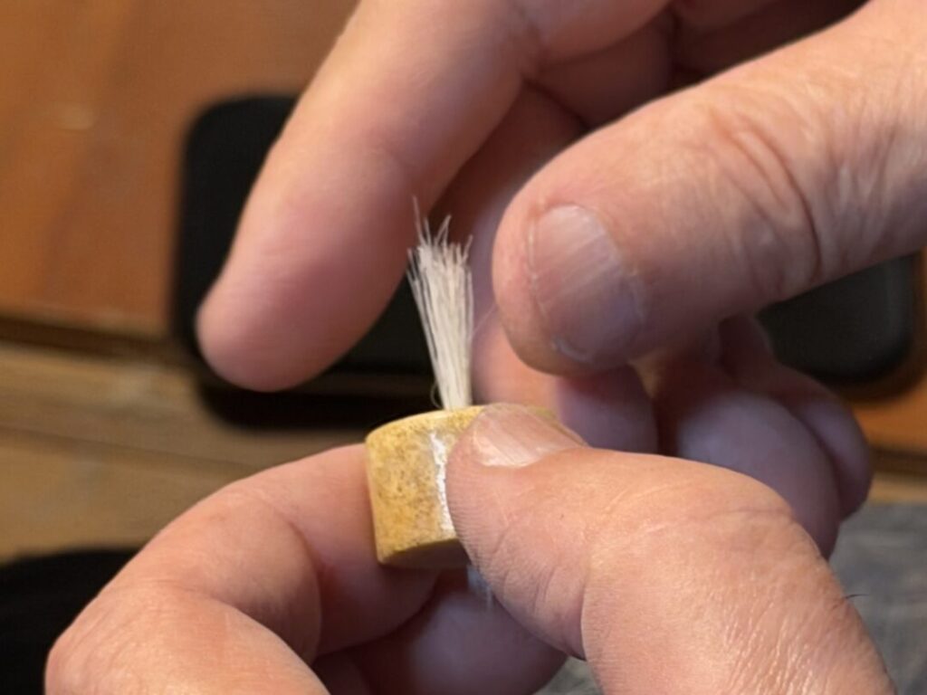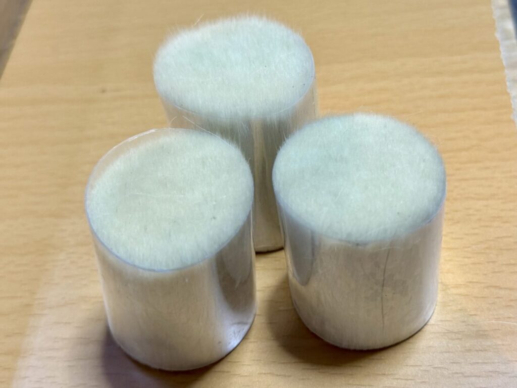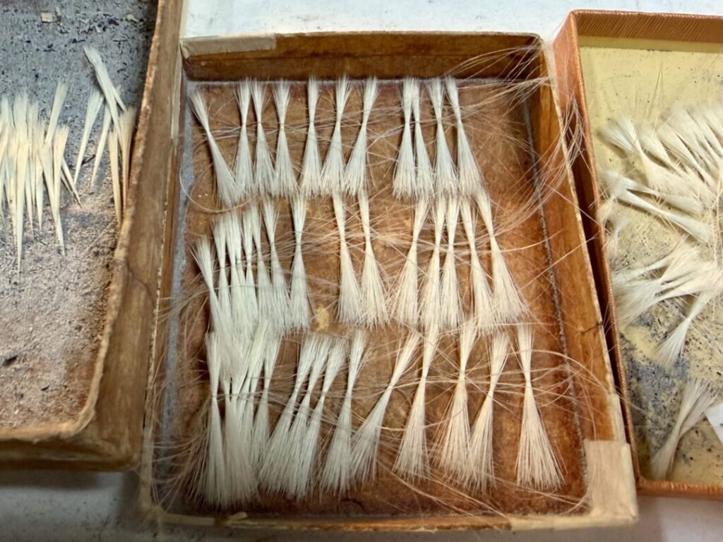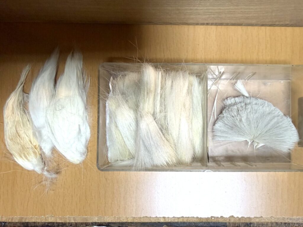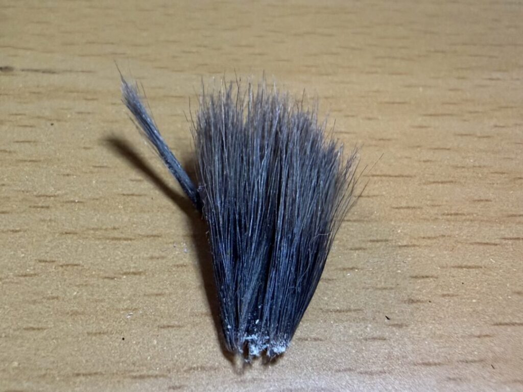 木造船や日本家屋にいるネズミの水毛(うぶ毛)が最良とされていましたが、時代の流れや環境の変化により徐々に入手困難となり、今では幻の素材となりました。以前は村田さんのところに2~300枚(匹分)、多い時で1,000枚くらい入っていたのが、今ではもうストックしているわずかな毛で終わりとのことでした。